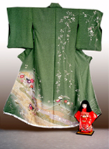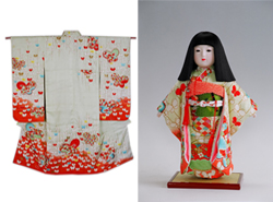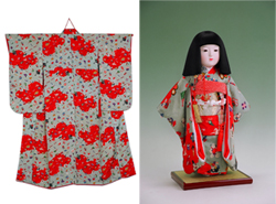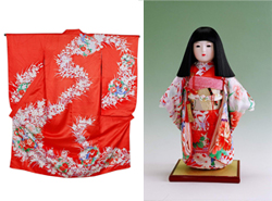 通常の場合。人形は上下に分かれ、着物も糊付けされますが、本品は人形サイズで仕立てた着物を実際の幼子に着せるように丁寧に着付けます。 |